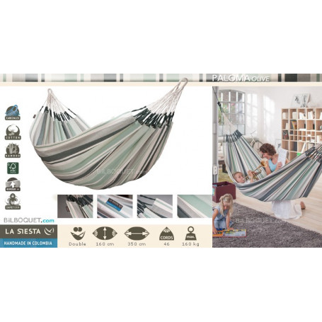 Combinant élégance, discrétion et confort, le hamac double PALOMA Olive est en pur coton. Il est fabriqué en Colombie, où le hamac appartient depuis des siècles à la culture du pays. Les hamacs colombiens se reconnaissent à la boucle de suspension ouverte, nommée Cabezales.